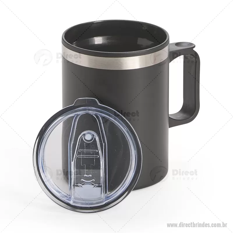 Procurando Caneca Plástica Com Inox Na Parte Interna Personalizada Barato, DRTCAN098 ? é aqui! Os melhores preços em Caneca plástica ou acrílica. Caneca de 375 ml com interior plástico e revestimento externo em inox, que evita o aquecimento das mãos. Possui tampa com bocal e trava de segurança, além de base emborrachada antiderrapante. Prática e ideal para o dia a dia. - Barato - DRTCAN098