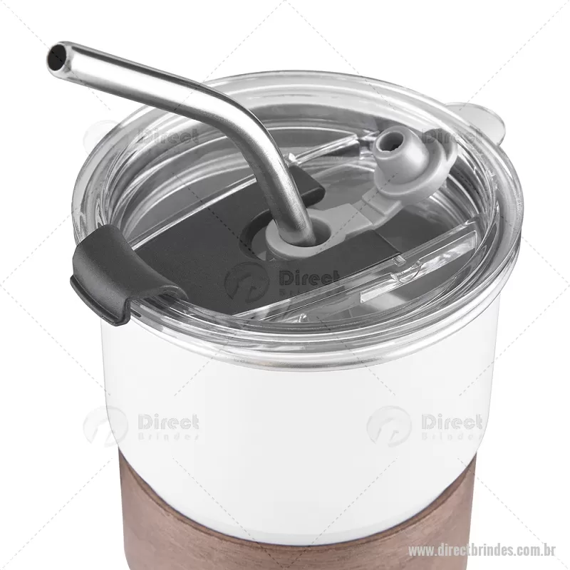 Copo em inox com Canudo Copo de parede simples em aço inox 304 com capacidade de 250ml, com canudo em inox. Tampa em plástico poliestireno (PS) que também possui um bico como forma alternativa de uso. Com pegador em fibra de noz. Possui acabamento externo com pintura fosca. Peso do Produto: 0,100kg Dimensão do Produto: 9xø7,5cm - Barato - DRTCPO150