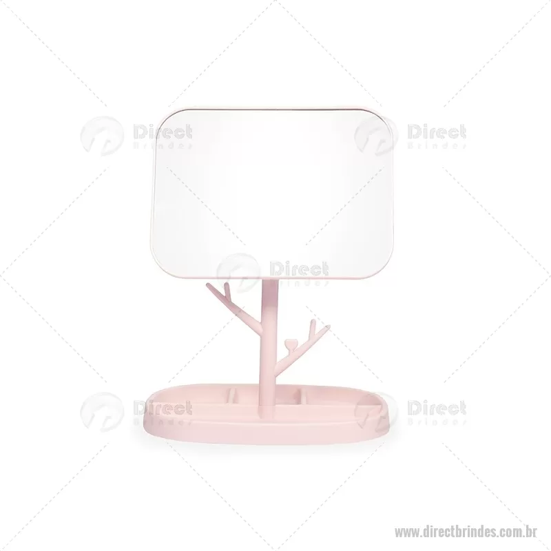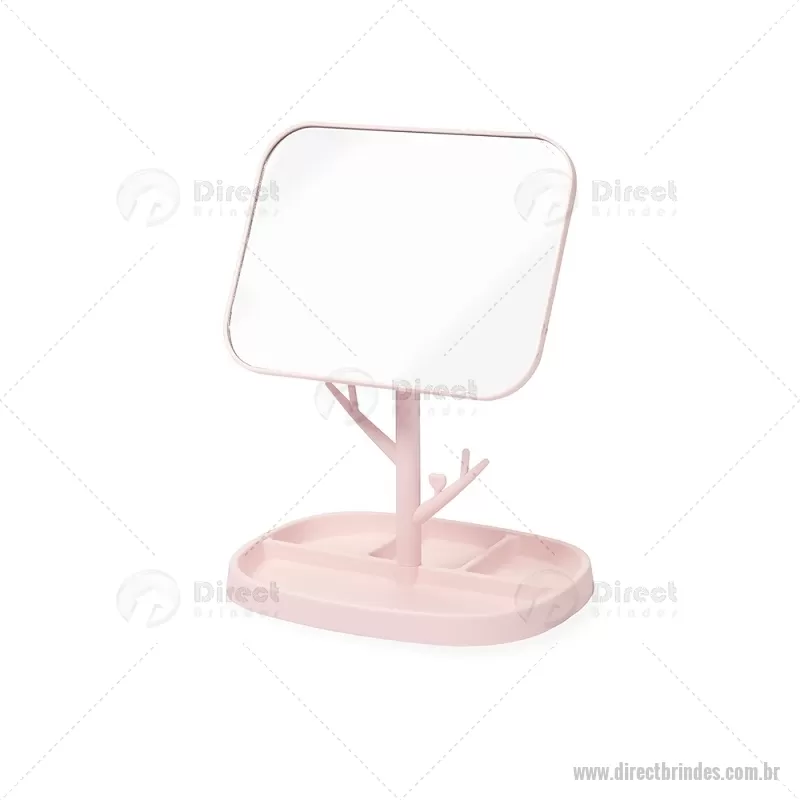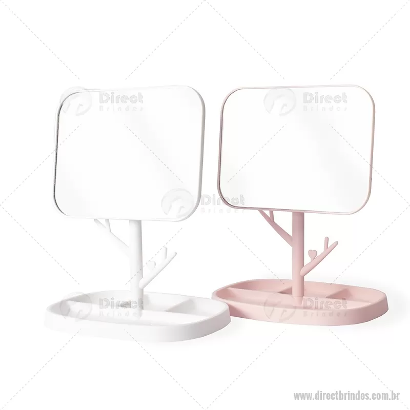 Espelho de mesa retangular e estrutura fácil de montar feita em plástico. Conta com pedestal giratório que permite ajustar o espelho em diferentes ângulos e posições. Além disso, possui ganchos laterais e quatro divisórias na base para organizar objetos. Altura : 30 cm x Largura : 15,5 cm x Comprimento : 20,5 cm Peso aproximado (g): 277 - Barato - DRTFEM119