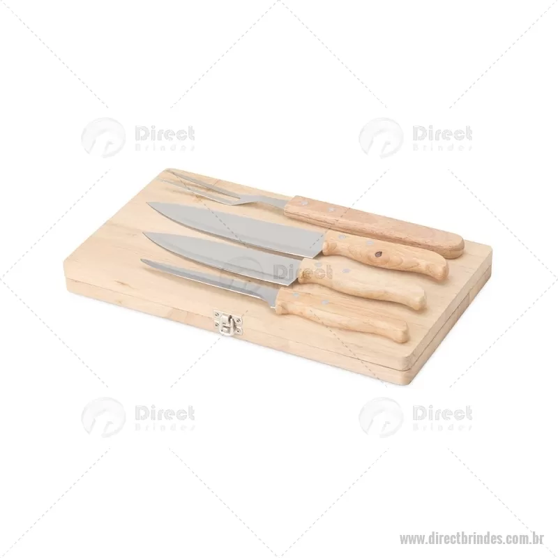 Kit Churrasco com 4 Peças e Estojo de madeira. Brinde ideal para quem curte passar o fim de semana cercado da família e amigos. Kit churrasco 4 peças em estojo de madeira. Contém três facas e um garfo. Altura : 3 cm x Largura : 35,4 cm x Profundidade : 19,8 cm Peso aproximado (g): 1449 - Barato - DRTKCH040