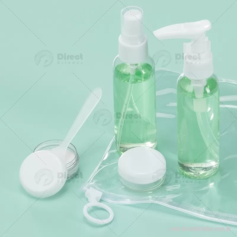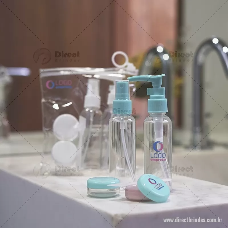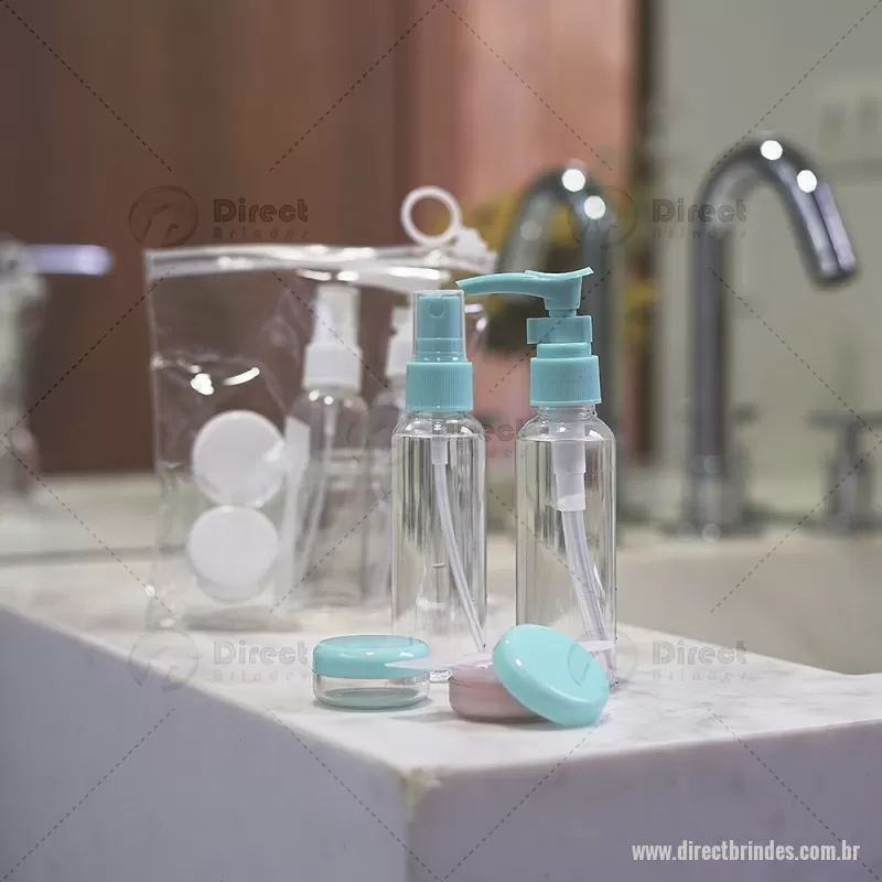 Kit Viagem 5 Peças Descrição: Kit viagem 5 peças em estojo ziplock. Contém frasco de 70ml com tampa spray; frasco de 70 ml com tampa pump; 2 potes de 10ml com tampa rosqueável e mini espátula fosca. Frascos plásticos e estojo em pvc com puxador plástico. Altura : 17,2 cm x Largura : 14,5 cm Peso aproximado (g): 61 - Barato - DRTKVG017
