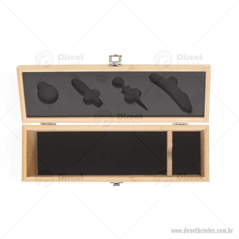 Kit Vinho em bambu com interior em EVA e fecho em inox, suporte para garrafa de vinho de 750 ml (padrão). Contém: saca-rolha de metal com detalhes em bambu e cortador de lacre, anel corta-gotas de metal, bico para servir de metal com tampa em bambu e tampa de metal com detalhe em bambu. Peso do Produto: 0,997kg Dimensão do Produto: 11x36x11cm *Não acompanha garrafa vinho, imagem meramente ilustrativa. - Barato - DRTKVI051