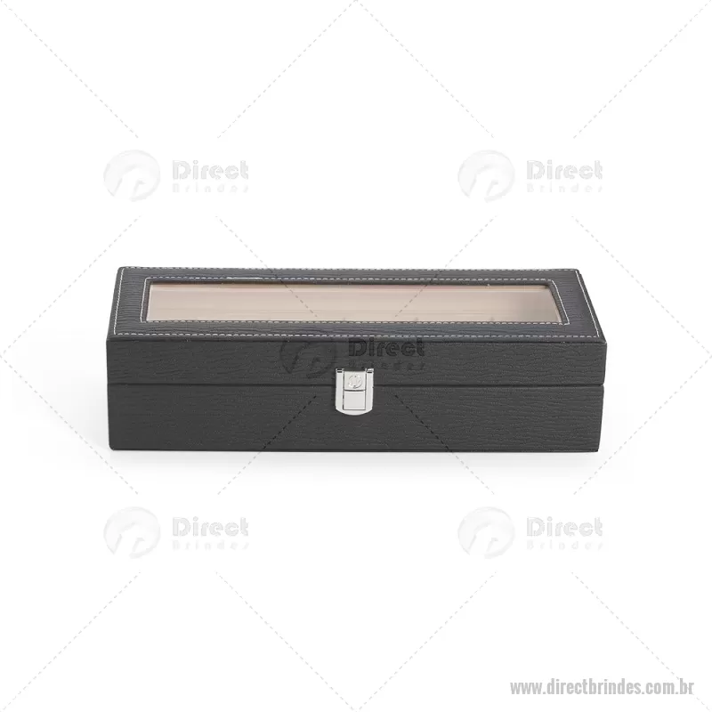 Porta-relógios com acabamento em couro sintético texturizado à base de PVC e interior revestido em tecido aveludado. Possui seis compartimentos com almofadas removíveis, visor em vidro transparente e trava de segurança, ideal para organizar e proteger relógios com elegância. - Barato - DRTPREL004