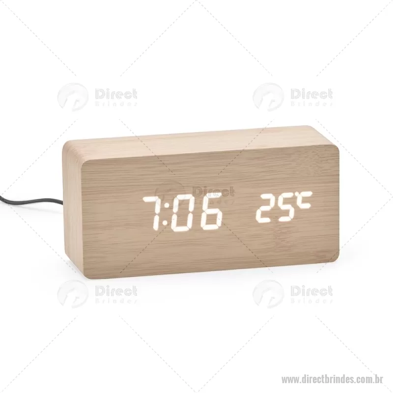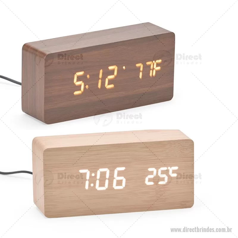 Relógio despertador em madeira com display LED, que combina design elegante e tecnologia moderna. Exibe horas, data e temperatura ambiente, além de permitir a programação de até três alarmes com diferentes configurações. Pode ser alimentado por 4 pilhas AAA (não inclusas) ou por cabo USB DC 5V, que acompanha o produto, oferecendo praticidade para o uso diário. - Barato - DRTREL023