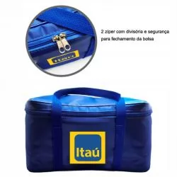 Bolsa Térmica Permeável com capacidade 10 litros Personalizada. * Contém 2 zíperes que assegura o completo fechamento da bolsa. * Material interno: PVC Sarja 0,15 Branco. * Consultar cores disponíveis. * Gravação em Silk Screen. Observação: A bolsa não é impermeável, portanto, não deve ser utilizada para carregar gelo e nem produtos congelados. Uma vez o alimento descongelando, a água irá vazar. Pode ser usada para levar mantimentos quentes e frescos. - Barato - DRTBT004