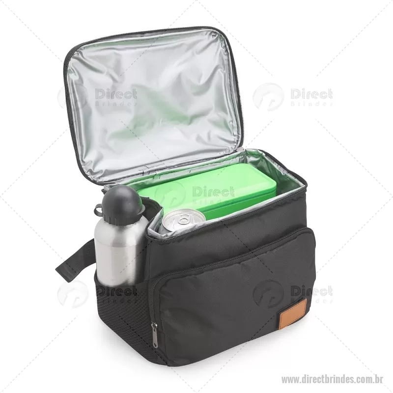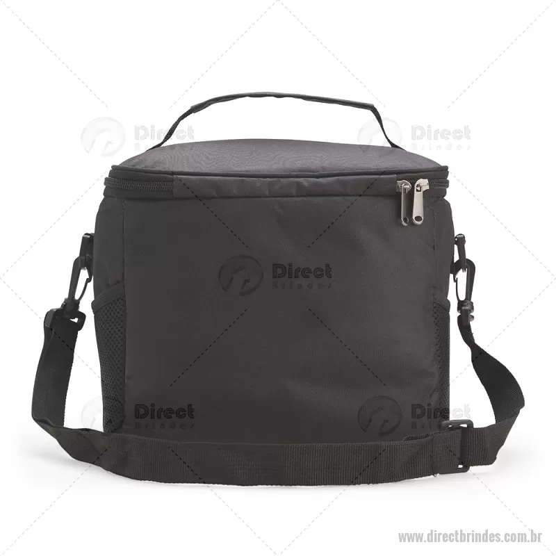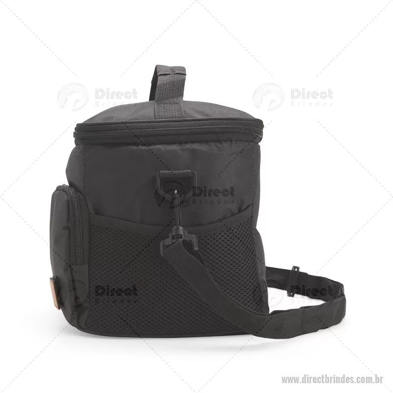 Bolsa térmica de 11 litros feita em Oxford resistente à água, com revestimento interno em PEVA atóxico e fechamento em zíper. Possui bolso frontal com plaquinha em couro sintético, dois bolsos laterais em tela, alça superior em nylon e alça transversal removível e ajustável. Prática e funcional para uso diário. - Barato - DRTBT101
