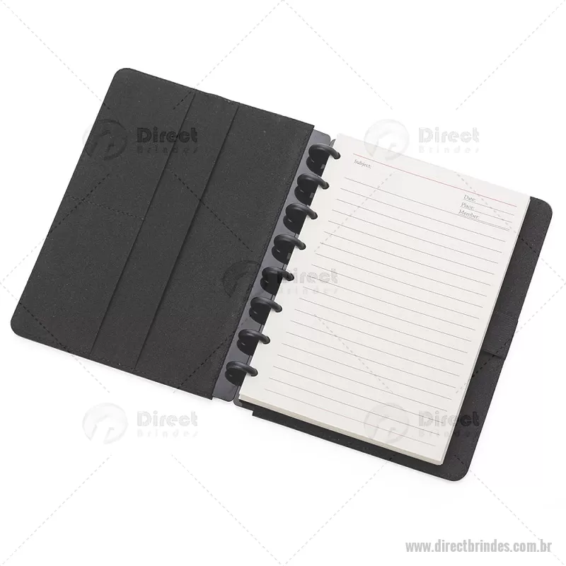 Caderno de anotações com capa dura em material sintético, contendo: Miolo de 80 folhas pautadas na cor bege; Porta Canetas; Porta Cartões; Obs.: As folhas do miolo são destacáveis. Dimensão do produto: 22,3x18,0x2,1cm (AxLxP) Peso do Produto: 0,438kg - Barato - DRTCAD025