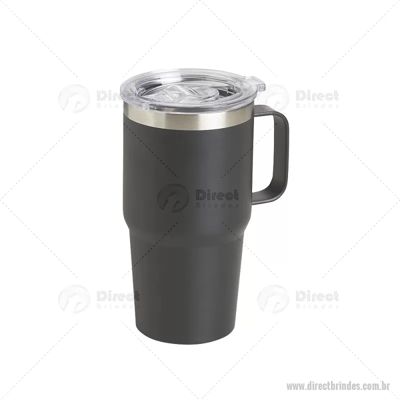 Caneca térmica de Inox com capacidade para 700ml. Acompanha uma tampa de plástico transparente.