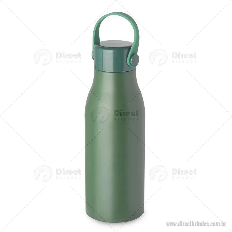 Garrafa em alumínio, tampa em plástico com alça na cor do produto. Capacidade de 550ml, pintura fosca.