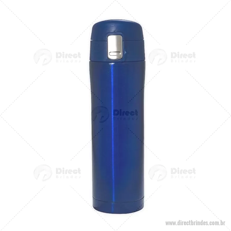 Garrafa térmica de 450ml de metal inteira colorida com botão de abertura prata. Possui um sistema de trava com desenho indicativo de cadeados(aberto e fechado), ao levantar o botão pequeno basta pressionar o botão central maior para abrir a tampa(possui na parte interna borracha protetora evitando vazar o líquido). Para abrir a tampa por completo basta rosqueá-la, parte interna revestida em inox. Altura : 24 cm x Largura : 6,9 cm x Circunferência : 20,6 cm Peso aproximado (g): 300 - Barato - DRTSQM009