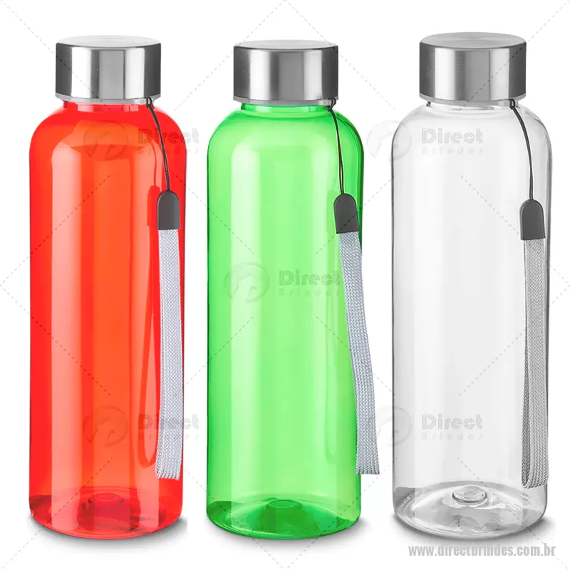 Procurando Garrafa Squeeze Plástico Com Alça Em Cordão Personalizada Barato, DRTSQP095 ? é aqui! Os melhores preços em Garrafa. Garrafa *RPET com capacidade de até 500ml com alça em cordão e tampa de metal.