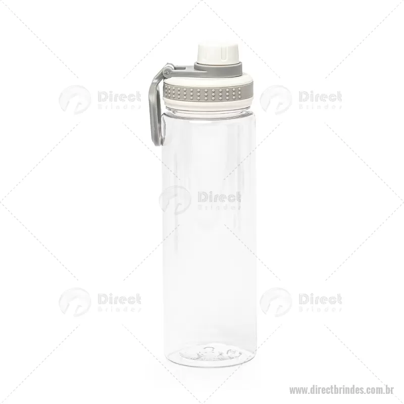 Garrafa plástica de 750ml com tampa rosqueável e bocal, tampa protetora e alça para facilitar o transporte.