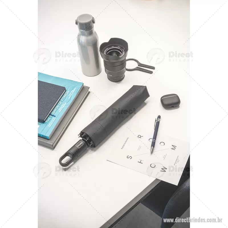 GUSTAVO. Guarda-chuva dobrável de 23'' em 100% poliéster reciclado pongee 190T (100% rPET) com abertura e fecho automático Guarda-chuva de 23'' em poliéster 100% reciclado pongee 190T, com varetas em fibra de vidro, haste metálica e pega em ABS 35% reciclado. O guarda-chuva, dobrável em 3 seções, tem abertura e fecho automático e é à prova de vento. Fornecido em bolsa. Medidas: ø1050 x 330 mm | Sacola: ø50 x 250 mm Peso do Produto (g.): 380 - Barato - DRTGCH052