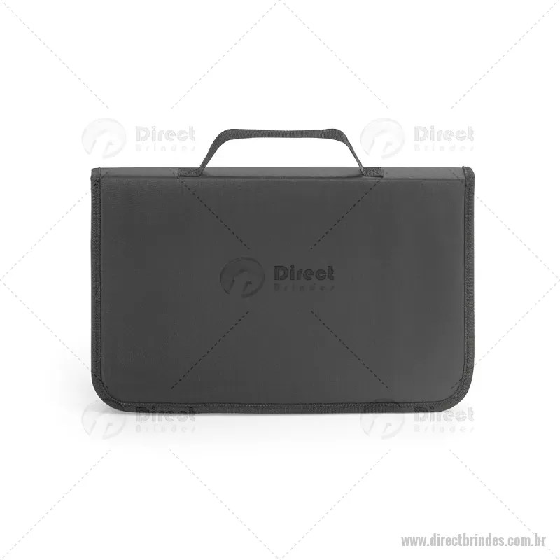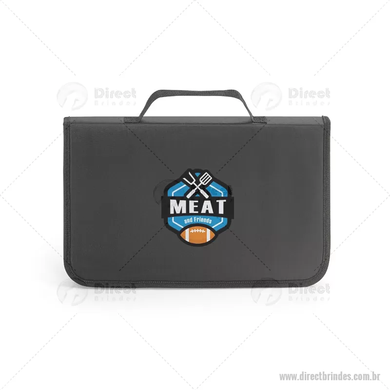 Kit churrasco em estojo de nylon 210D com tábua em PP e 5 utensílios em aço inox e PP: faca chefe, faca boning, faca pequena, garfo e afiador. Certificação EU Food Grade. Estojo: 350 x 230 x 40 mm | Tábua: 283 x 192 x 5 mm - Barato - DRTKCH056