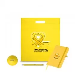 Kit escritório 4 peças. Contém: Sacola. Non-woven: 80 g/m². (SAC014 ), Bloco Caderneta com capa sintético com pauta (BLC120), Caneta metal fina personalizada com ponteira touch (CMT165) e Anti-Stress bolinha lisa e oca. (ANT001). - Barato - DRTKIT027
