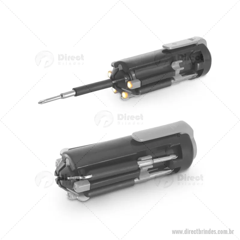 Conjunto de ferramentas em ABS com clipe, 4 LEDs e 5 pontas diferentes removíveis. Incluso 2 pilhas AAA. 90 x 30 x 35 mm - Barato - DRTFER050