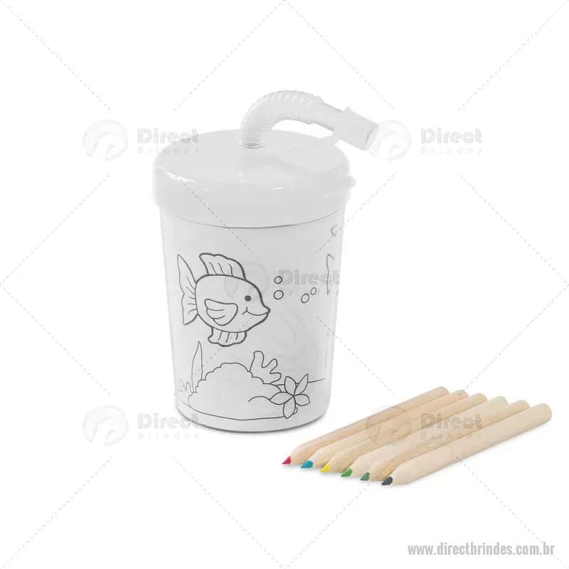 Copo para viagem para crianças em PP e PS com canudo flexível e capacidade até 200 mL. Corpo com 3 desenhos diferentes para colorir (6 mini lápis em cor inclusos). ø72 x 98 mm - Barato - DRTKIDS019