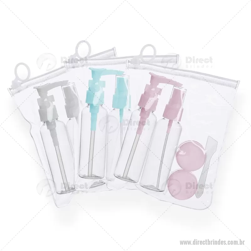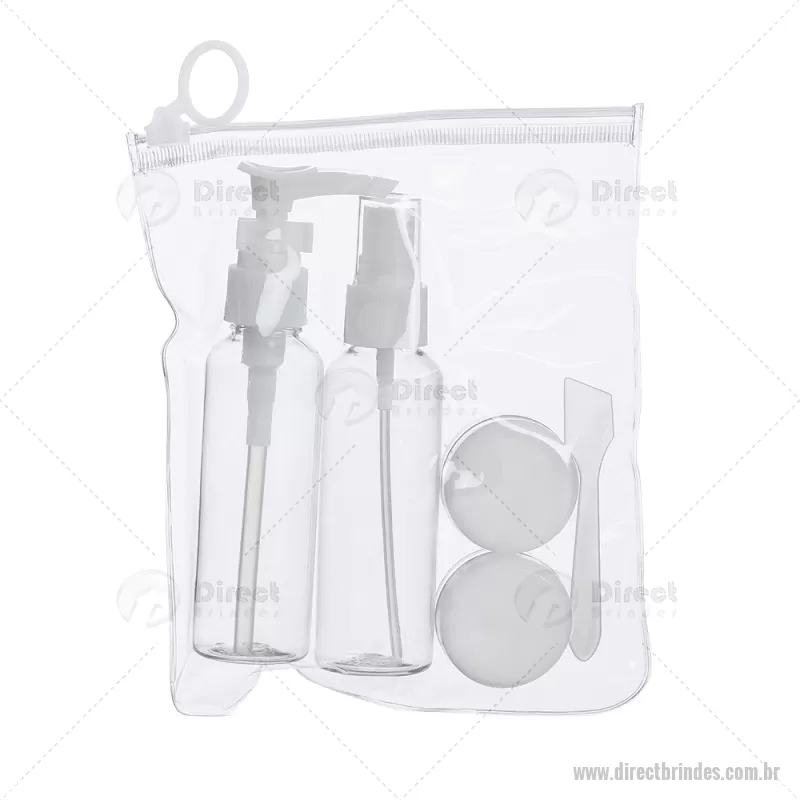 Kit Viagem 5 Peças Descrição: Kit viagem 5 peças em estojo ziplock. Contém frasco de 70ml com tampa spray; frasco de 70 ml com tampa pump; 2 potes de 10ml com tampa rosqueável e mini espátula fosca. Frascos plásticos e estojo em pvc com puxador plástico. Altura : 17,2 cm x Largura : 14,5 cm Peso aproximado (g): 61 - Barato - DRTKVG017