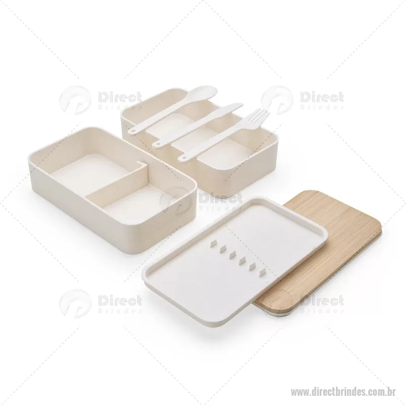 Marmita dupla em fibra de trigo, sendo um compartimento de 600ml com tampa de bambu e outro compartimento de 500ml com suporte para talheres de fibra de trigo. Possui uma divisória removível e elástico para um transporte seguro. Acompanha garfo, faca e colher. Obs: O tempo de aquecimento no micro-ondas não deve ultrapassar 3 minutos. - Barato - DRTMMT017
