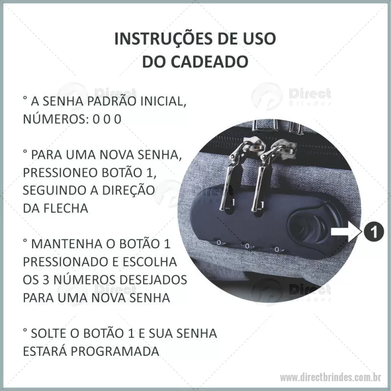 Uma mochila moderna com bastante espaço interno incluindo porta notebook, possui fechamento em cadeado com segredo. Alça de mão em metal, fita reflexiva, um bolso frontal grande. Divisórias internas para canetas, documentos e telefone celular. Alça almofadada. Saída USB e fone de ouvido. Tecido em poliéster. Esta é a melhor escolha para surpreender seus clientes, parceiros ou funcionários. - Barato - DRTMC118