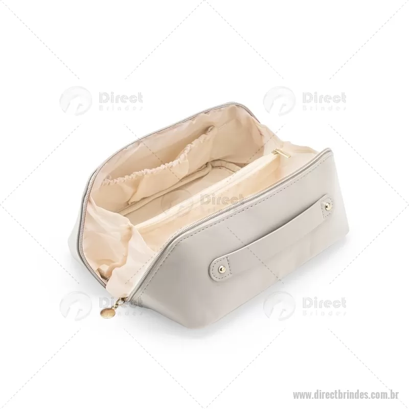 Nécessaire em (PU) poliuretano impermeável com abertura em 180 graus inspirada no formato de concha. O compartimento interno conta com dois bolsos laterais abertos e um, localizado na parte central, com fechamento em zíper. Possui alça para transporte. Altura : 11 cm x Largura : 22,5 cm x Profundidade : 9,5 cm Peso aproximado (g): 108 - Barato - DRTNC143