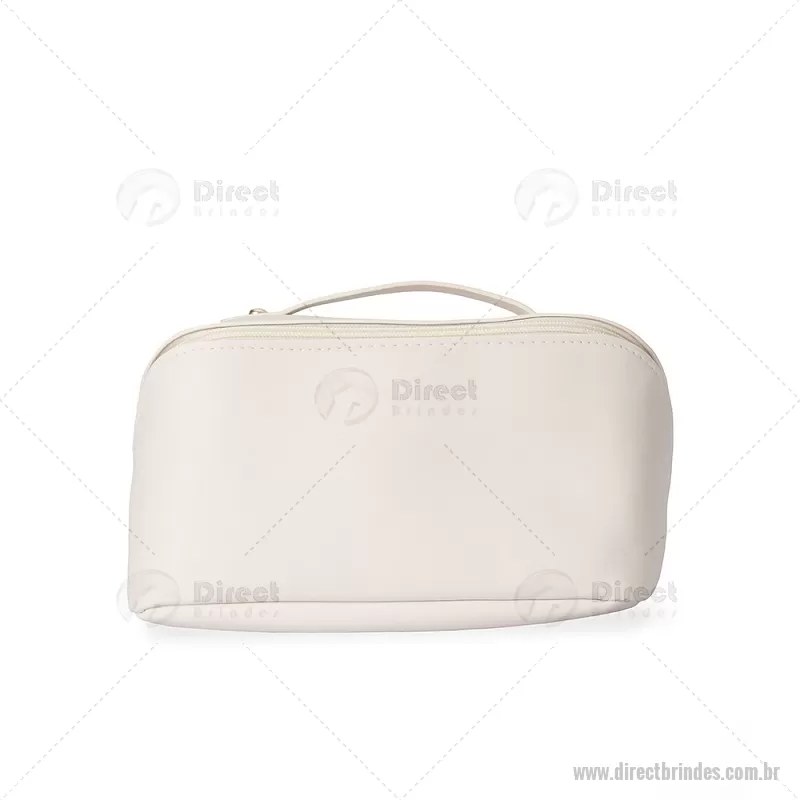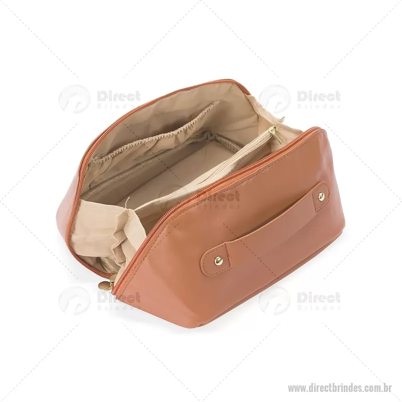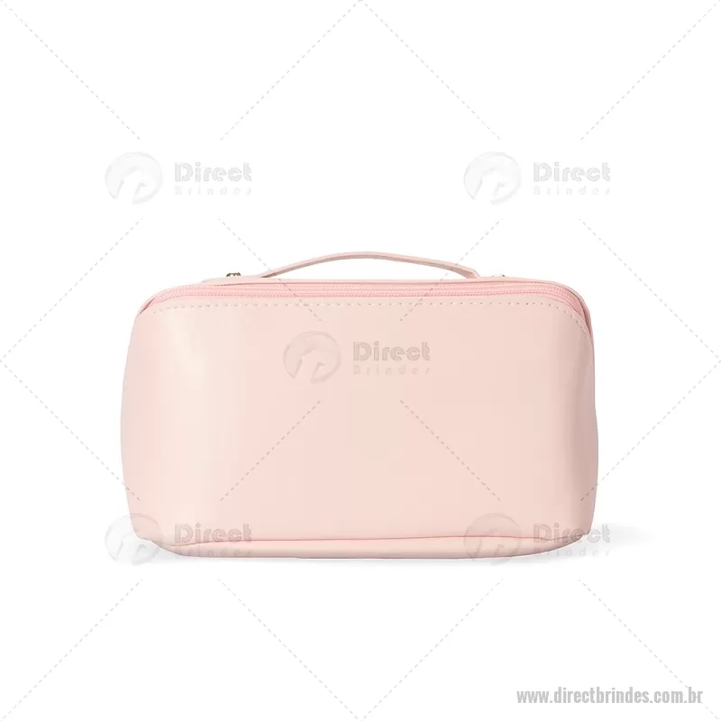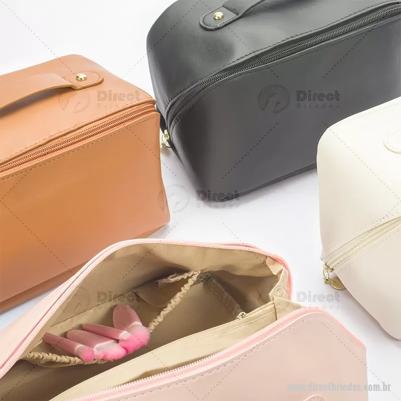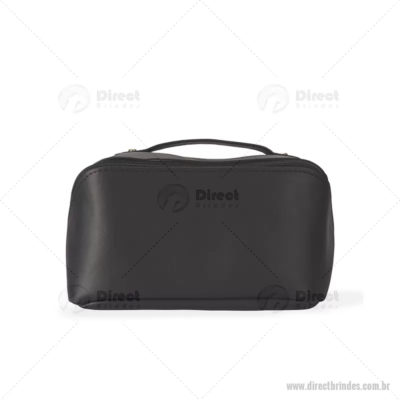 Nécessaire em PU impermeável com abertura em 180 graus, estilo concha, oferecendo fácil visualização dos itens. Possui compartimento interno amplo com dois bolsos laterais e um bolso central com zíper, além de alça para transporte. Ideal para organizar acessórios e produtos pessoais. - Barato - DRTNC146