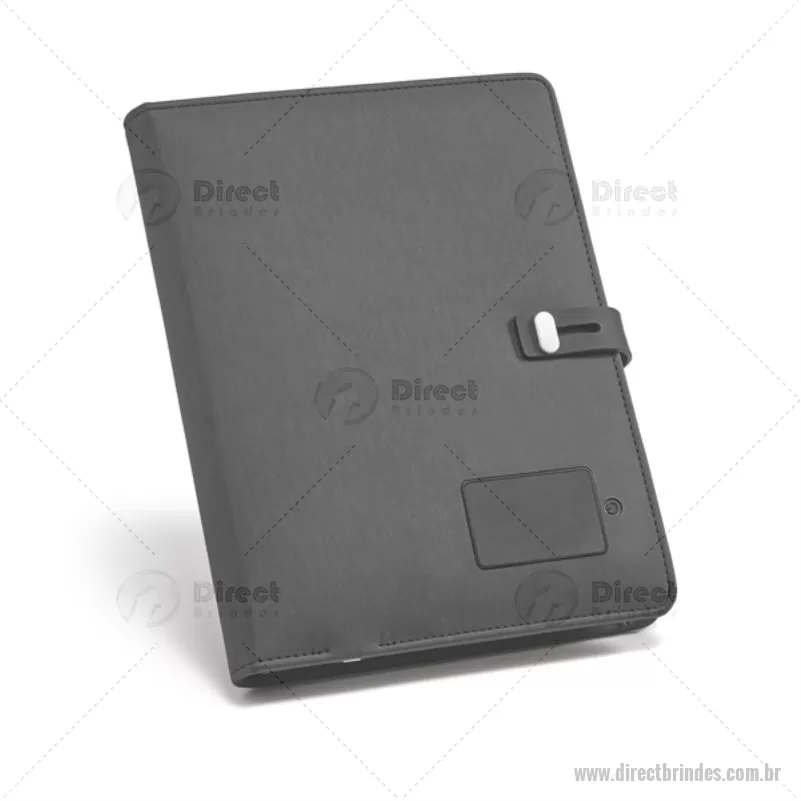 Pasta A5. C. sintético. Bateria portátil embutida (lítio). Capacidade: 4.000 mAh. Tempo de vida ≥ 500 ciclos. Com entrada/saída 5V/1A e cabo USB/micro USB para carregar a bateria. Caderno removível: 64 folhas pautadas cor marfim. Elásticos interiores para organização e suporte para smartphone. Placa com acabamento em borracha, LED interior e botão on/off. Fornecida em caixa presente. Esferográfica não inclusa. Medidas - Pasta: 16,5 x 22,5 x 2,5 cm / Placa: 5,5 x 3,5 cm / Caixa: 18,0 x 24,0 x 3,5 cm. Brinde ideal para congressos e eventos corporativos. - Barato - DRTTEC308