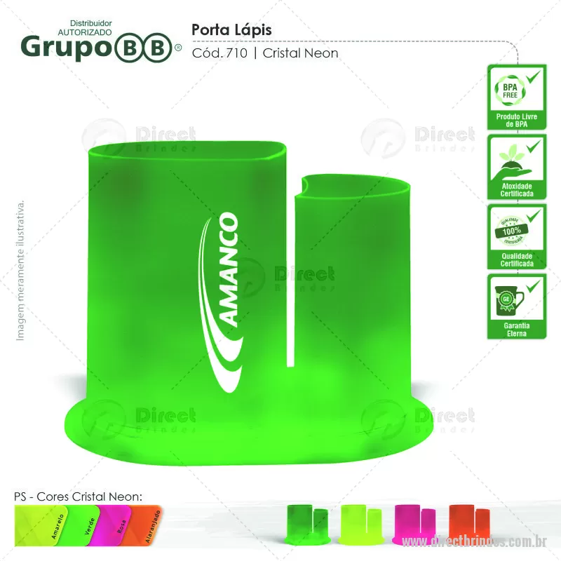 Porta Lápis com duas cavidades com espaço para cartão de visita. Seu design arredondado é de exclusividade do Grupo BB! Feito em plástico translúcido, dando elegância ao produto. Cores Disponíveis - CRISTAL: Transparente, verde, vermelho, azul, lilás / NEON CRISTAL: rosa neon, verde neon, amarelo neon, alaranjado neon. Ótima opção de brinde para feiras escolares e eventos corporativos. Personalização 1 cor. Outras opções sob consulta. Distribuidor Autorizado Grupo BB. - Barato - DRTZ710
