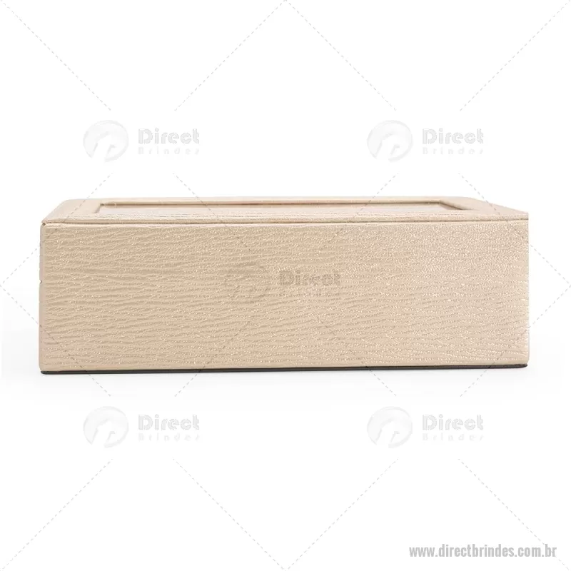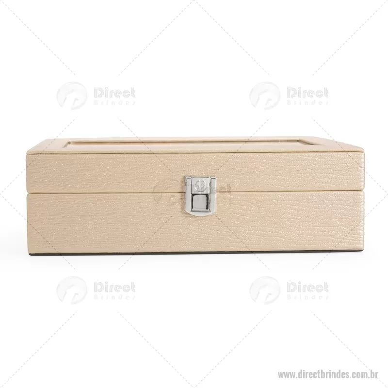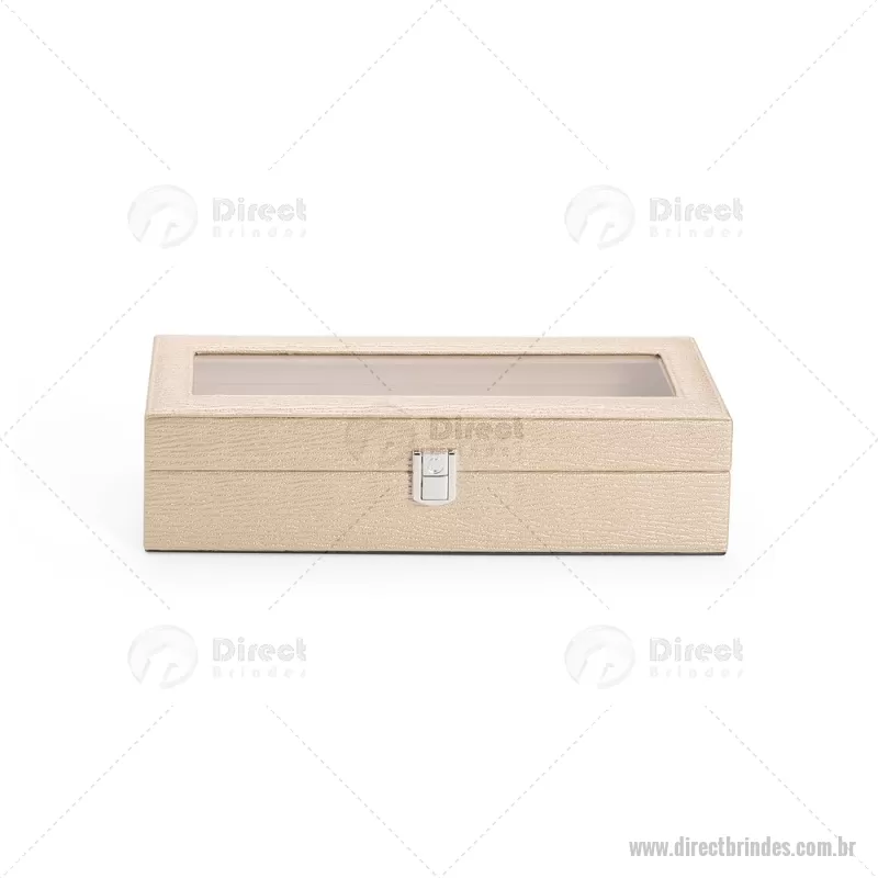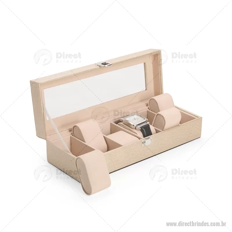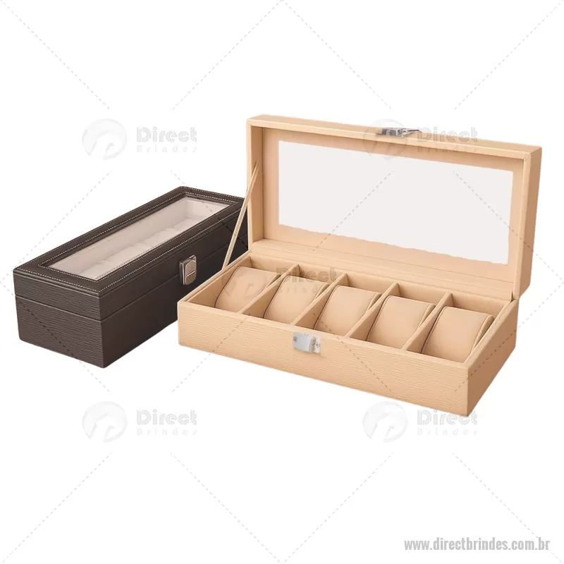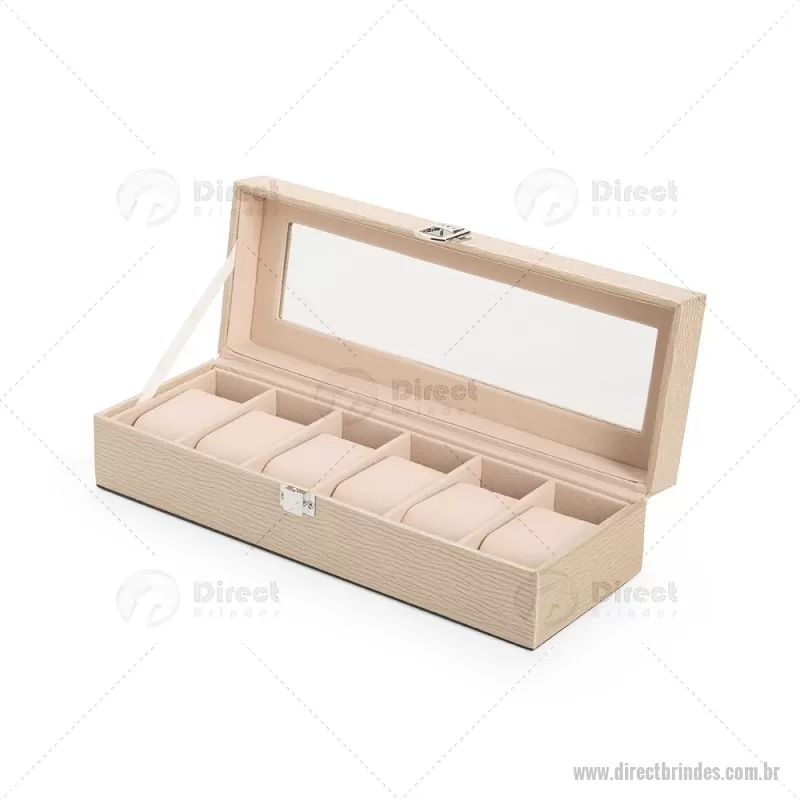 Porta-relógios com acabamento em couro sintético texturizado à base de PVC e interior revestido em tecido aveludado. Possui seis compartimentos com almofadas removíveis, visor em vidro transparente e trava de segurança, ideal para organizar e proteger relógios com elegância. - Barato - DRTPREL004